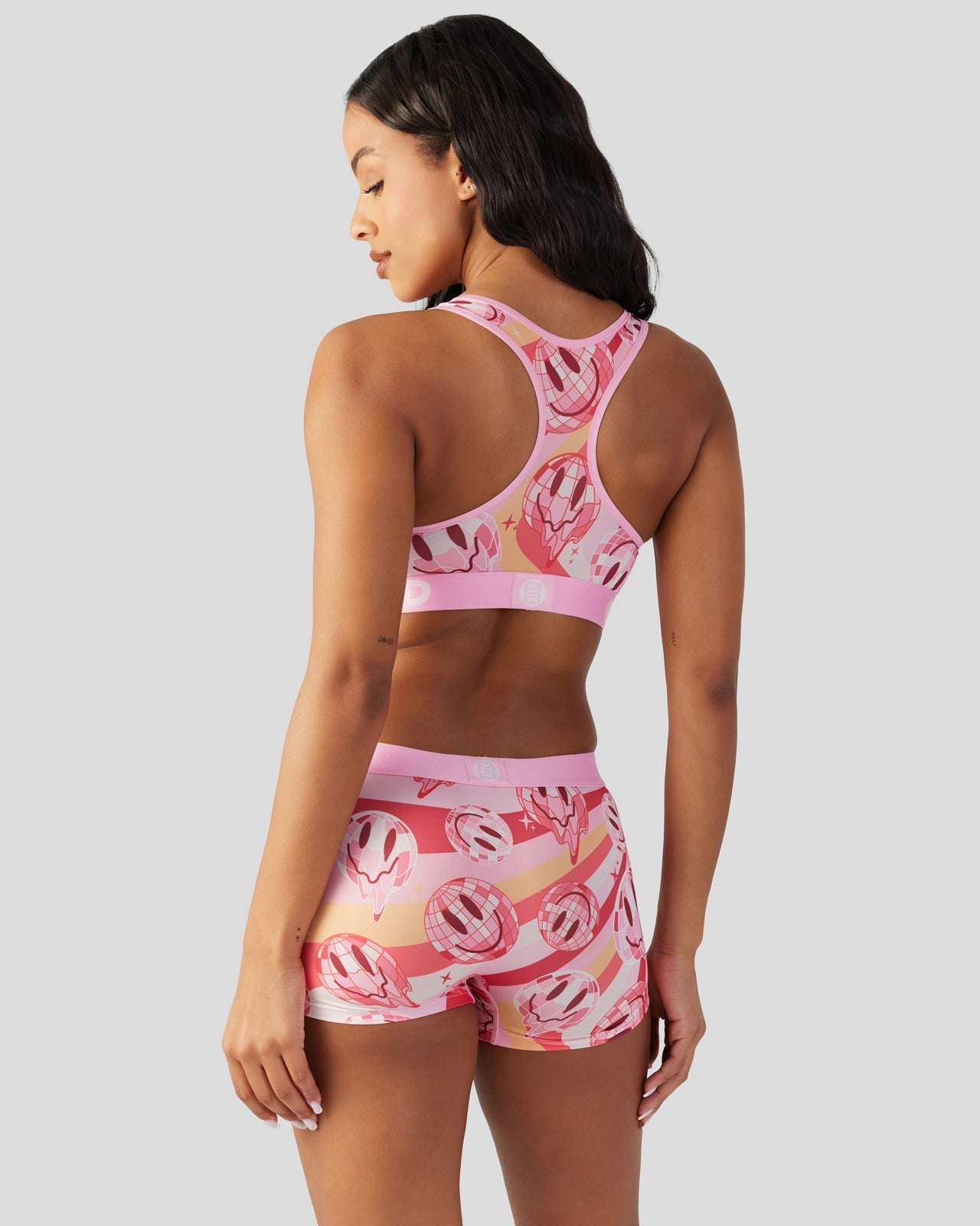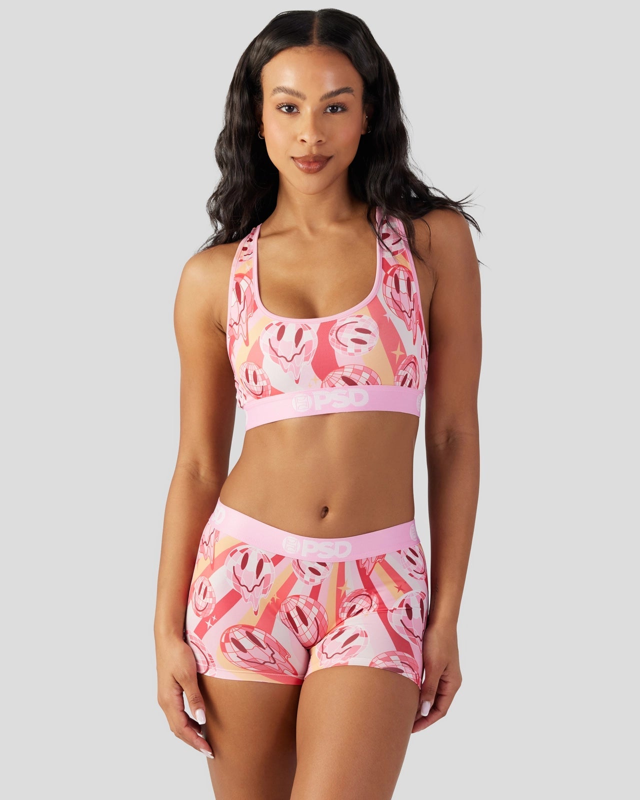 The ’70s are back with this retro new look for women. Featuring smiley-faced disco balls and a vintage-inspired striped pattern. the ’70s Smiley Sports Bra is made from a silky poly blend with a comfortable full coverage. keep-you-in fit. The PSD boy shorts are perfect for everyday wear and working out.