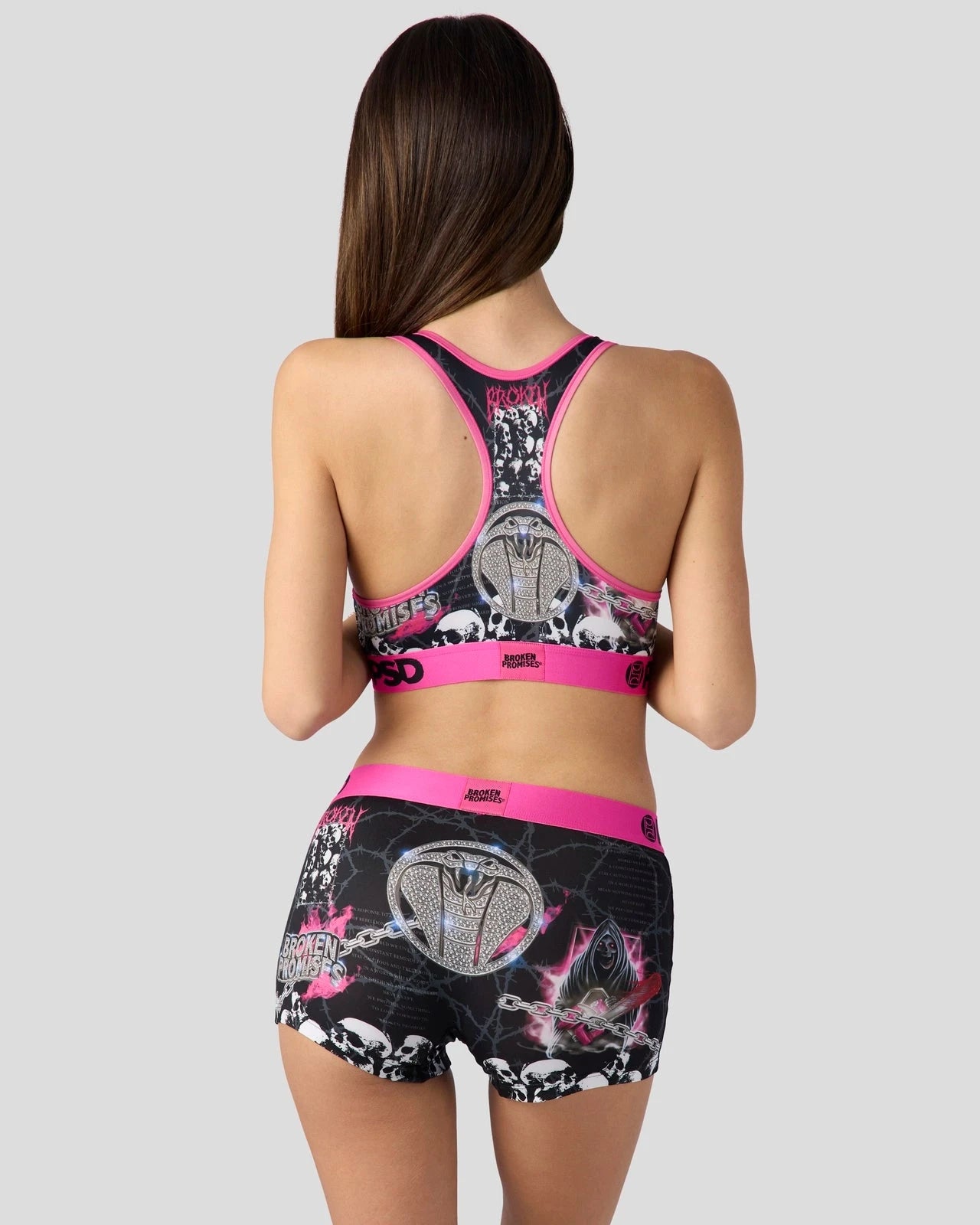 Let your emotions get the best of you with this look from Broken Promises x PSD. The Chainsaw Sports Bra is made from a silky poly blend and is breathable yet slightly compressive. bringing you the comfort and support you need for everything you get into.