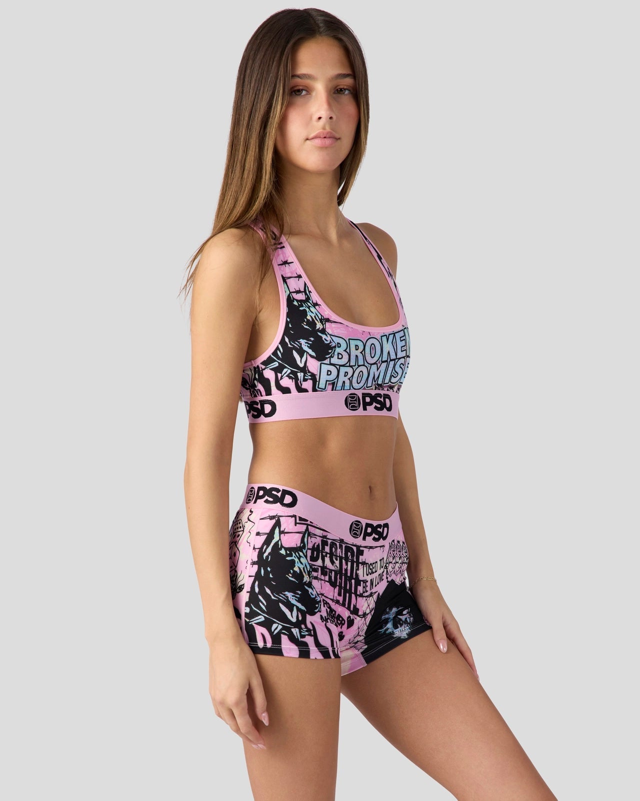 Our first collaboration with Broken Promises is here. Featuring a print inspired by their iconic graphics. the Holo Promises Boy Short is made from a silky poly blend with a comfortable full coverage. keep-you-in fit. The PSD boy shorts are perfect for everyday wear and working out.