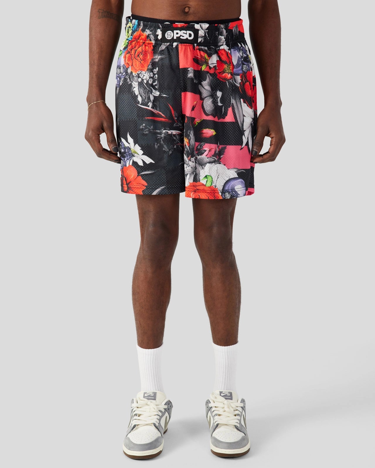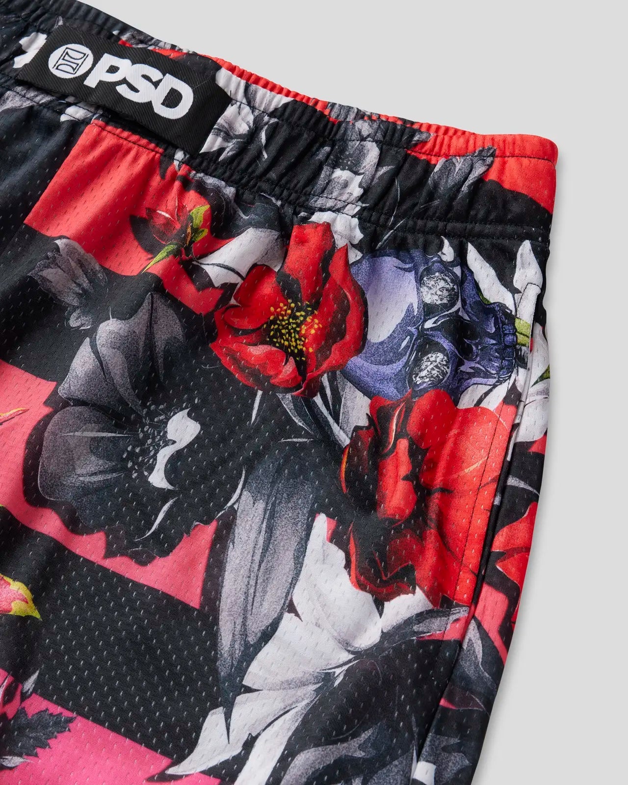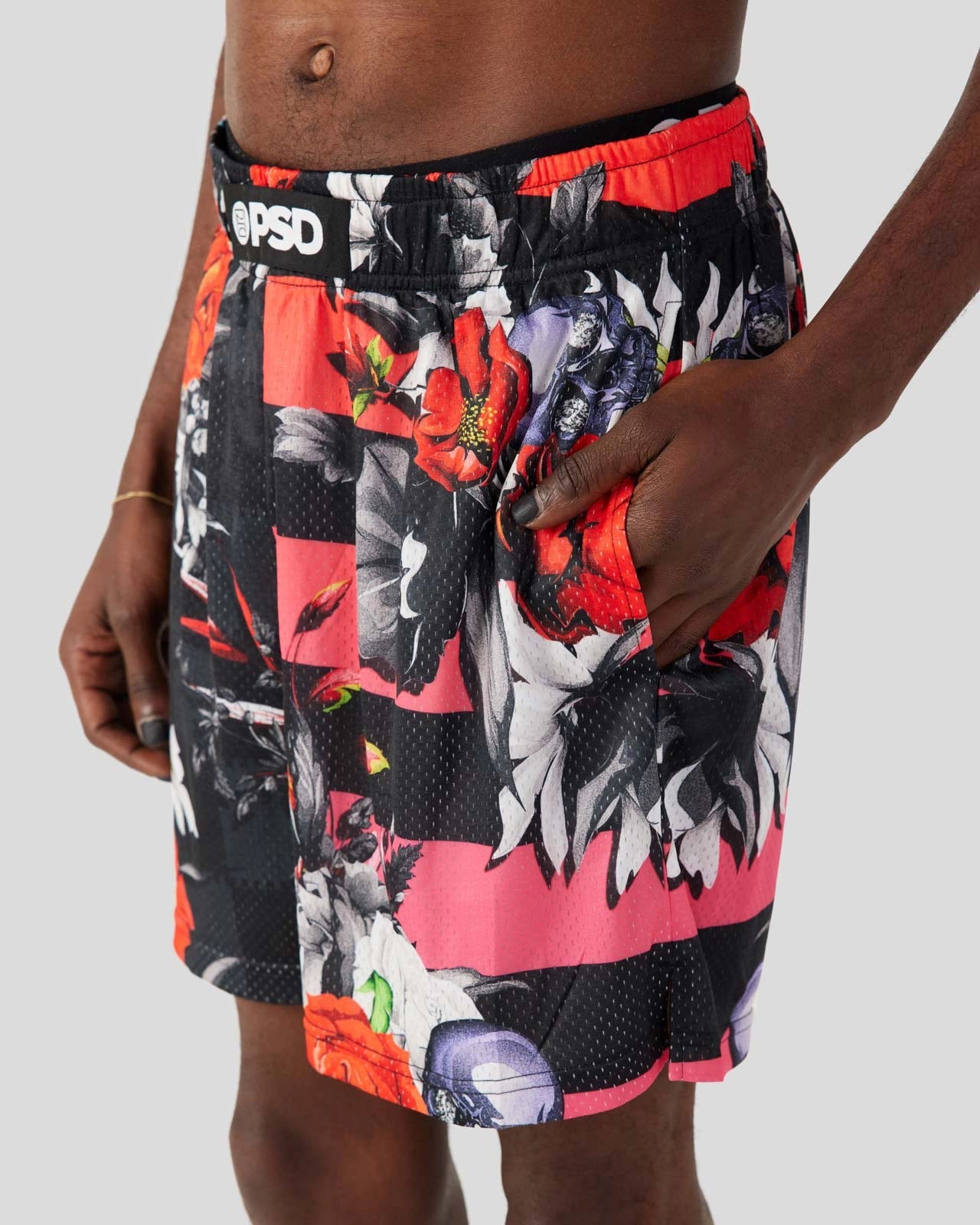 Floral print. but make it tough. The PSD Men’s Floral Demise Active Shorts feature an overlay of florals with stripes and checkers underneath. These shorts are made of lightweight and breathable mesh so you do your thing. whether you’re lounging at home or trying to stay cool on the court.