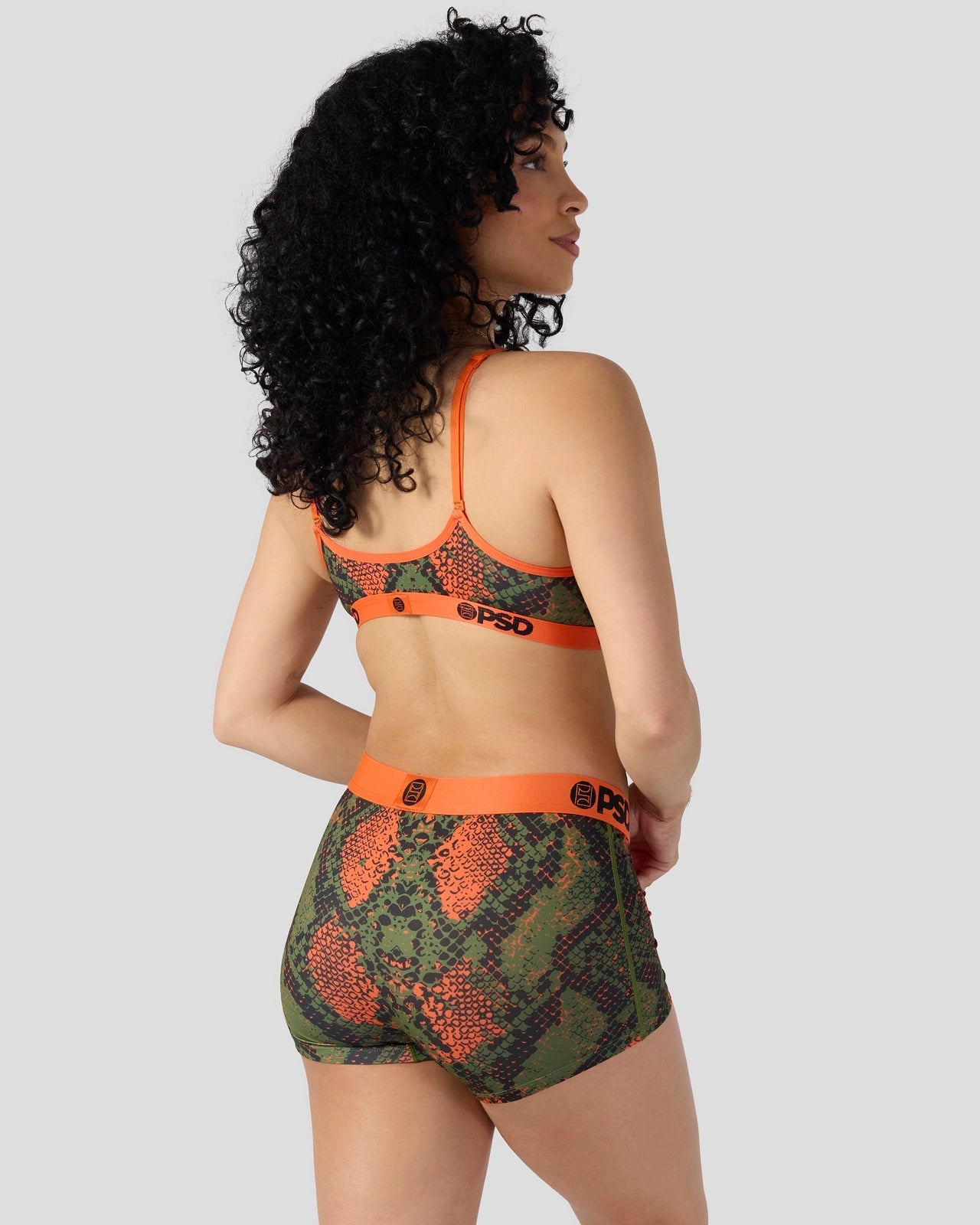 Slither your way into this new snakeskin-inspired look. The Green Snake Boy Short is made from a silky poly blend with a comfortable full coverage. keep-you-in fit. The PSD boy shorts are perfect for everyday wear and working out.