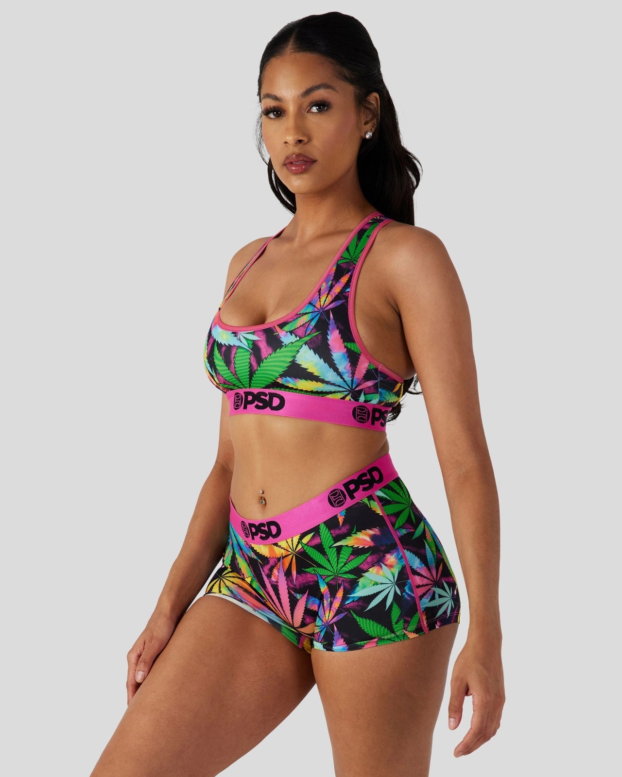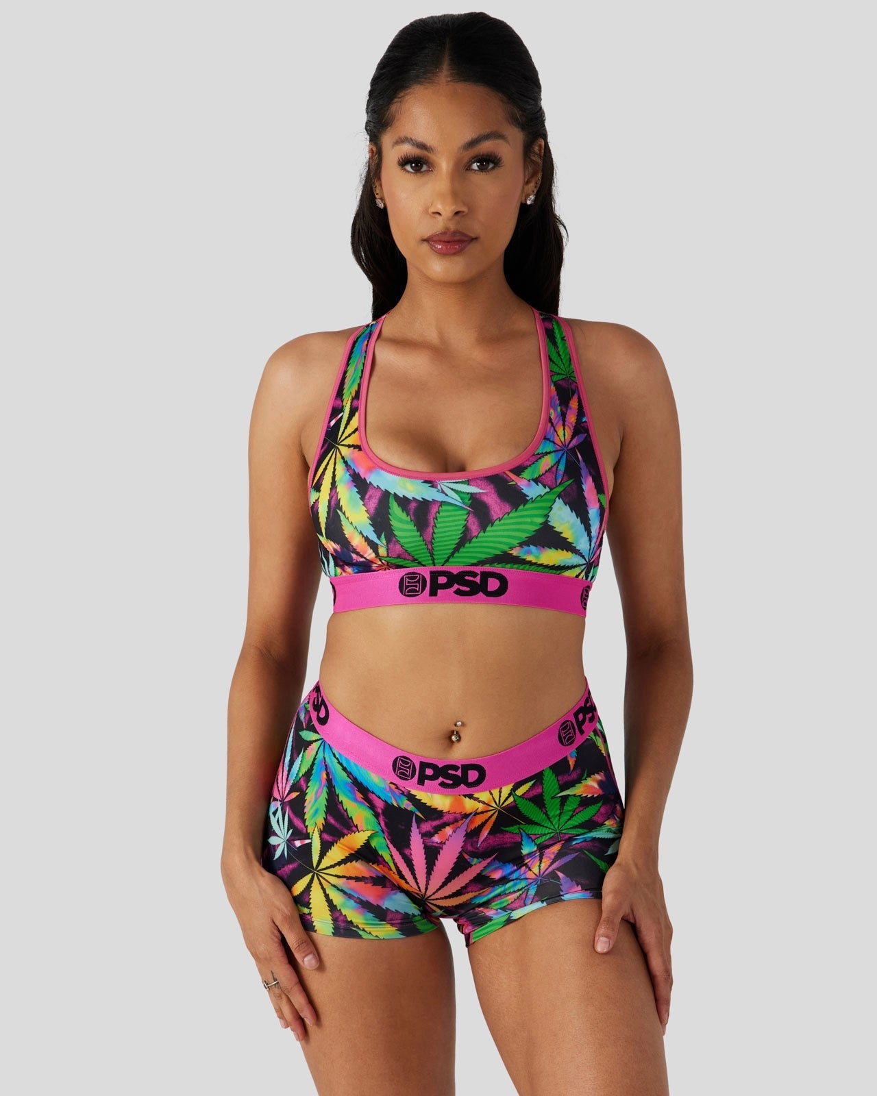 Elevate to your highest sense of self in this psychedelic new bra. Made with our silky poly blend. the PSD Happy High Sports Bra is breathable yet slightly compressive. bringing you the comfort and support you need for everything you get into.