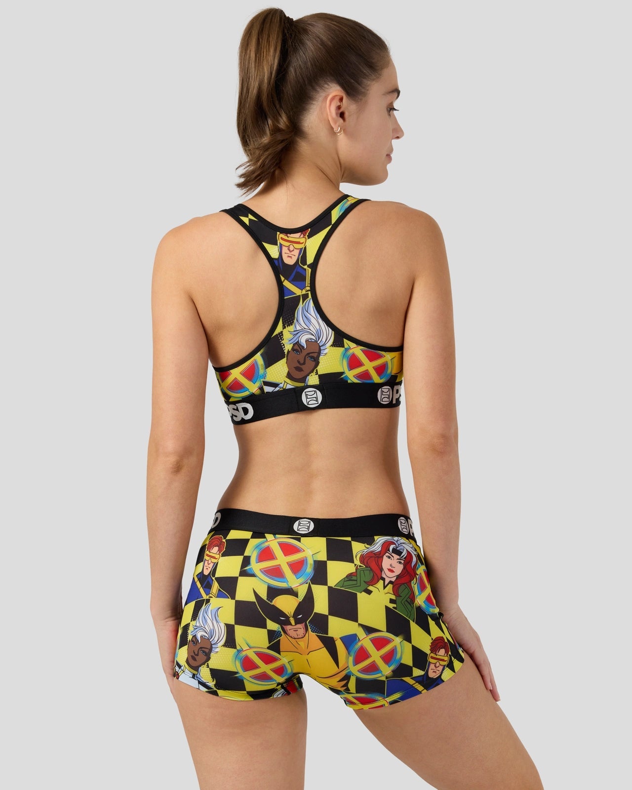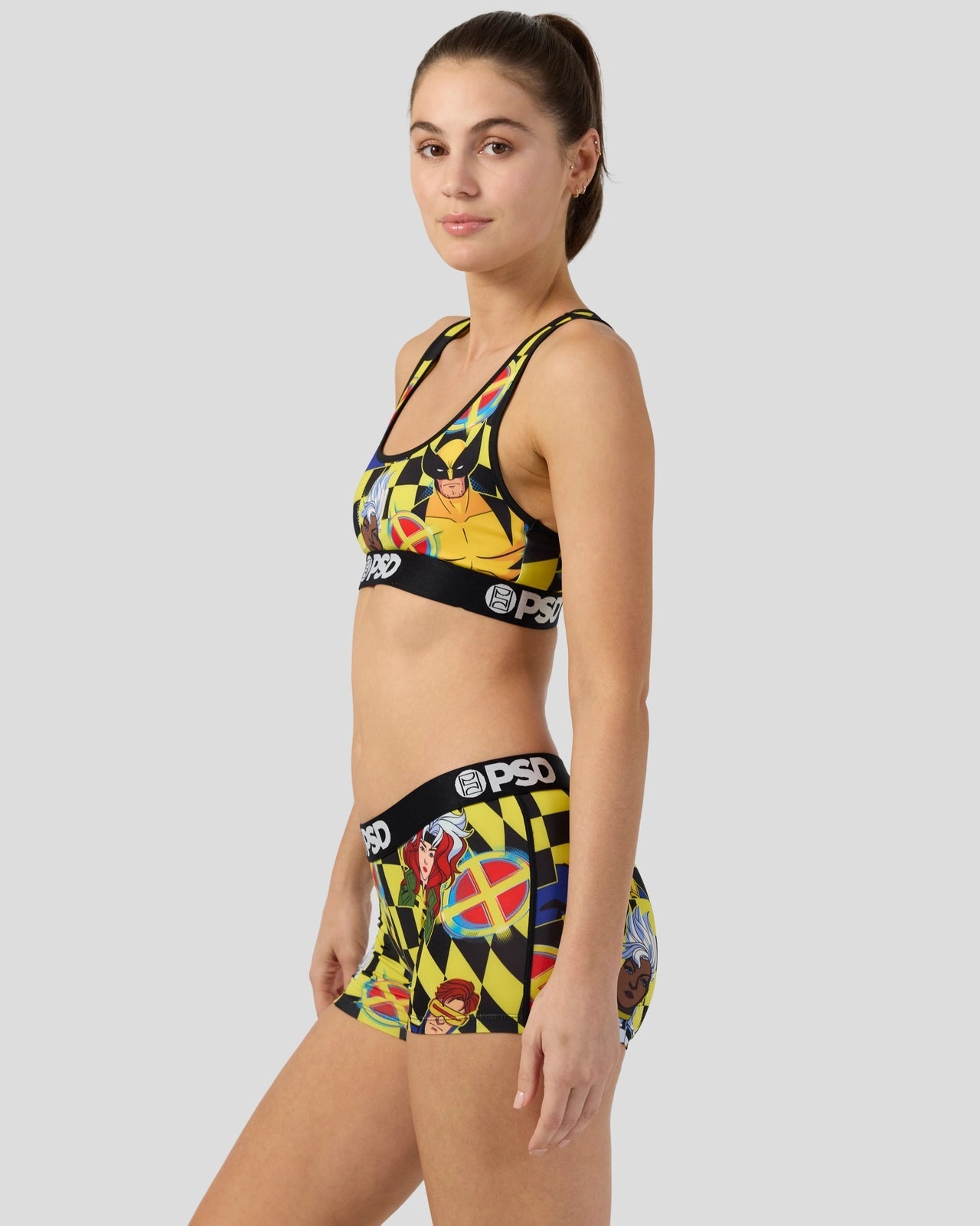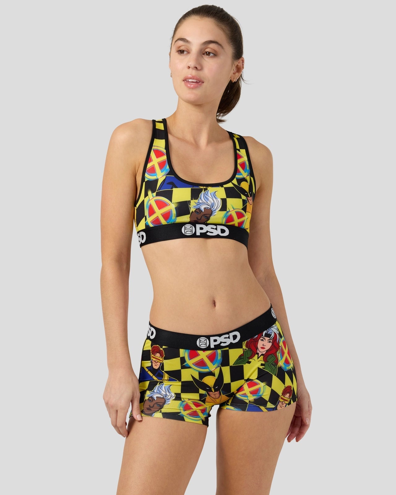 The Checkers Boy Short includes your favorite X-Men mutants Wolverine. Cyclops. Storm. and Rogue. Made of our silky poly blend with a comfortable full coverage. keep-you-in fit. the Boy Short is perfect for everyday wear and working out.