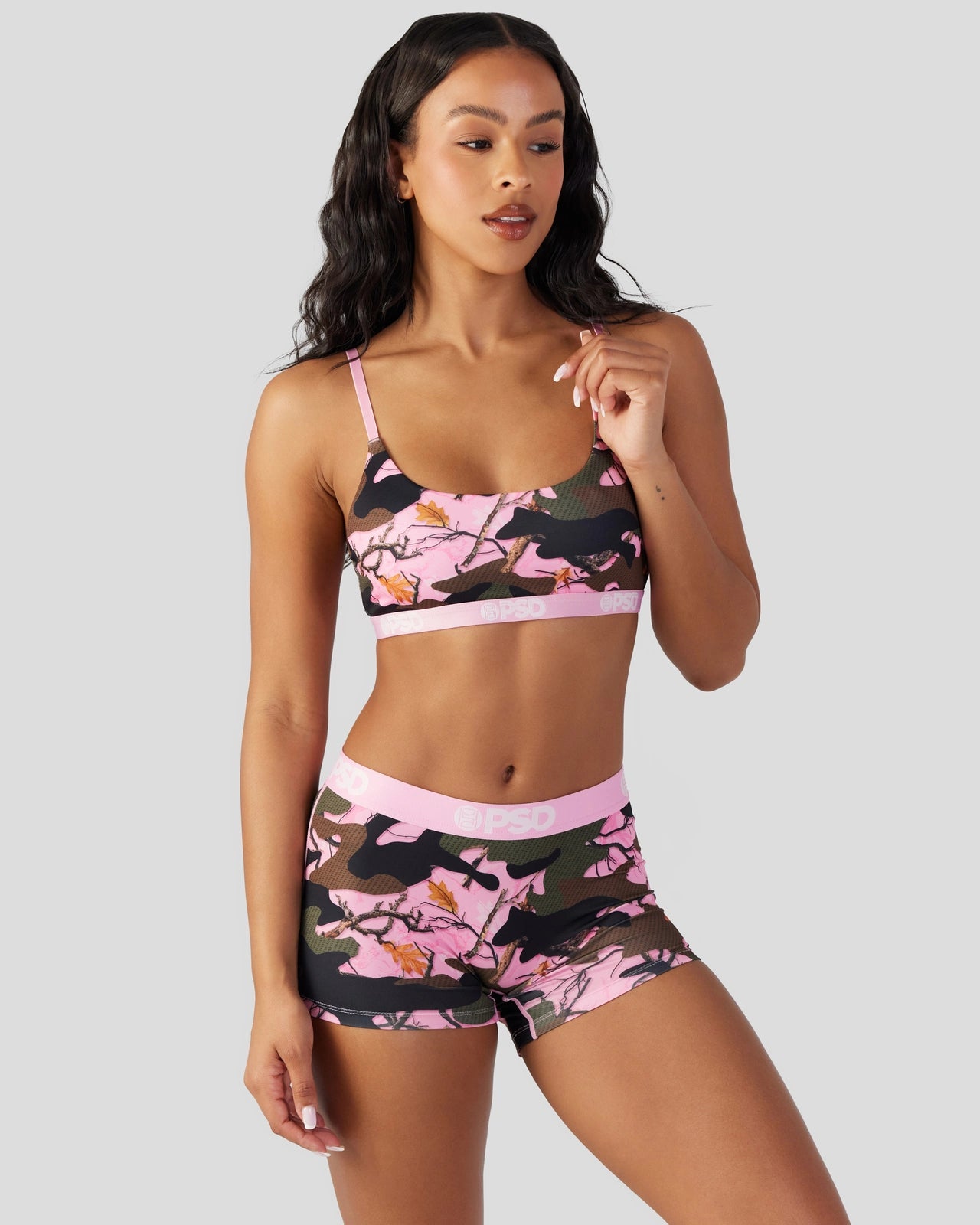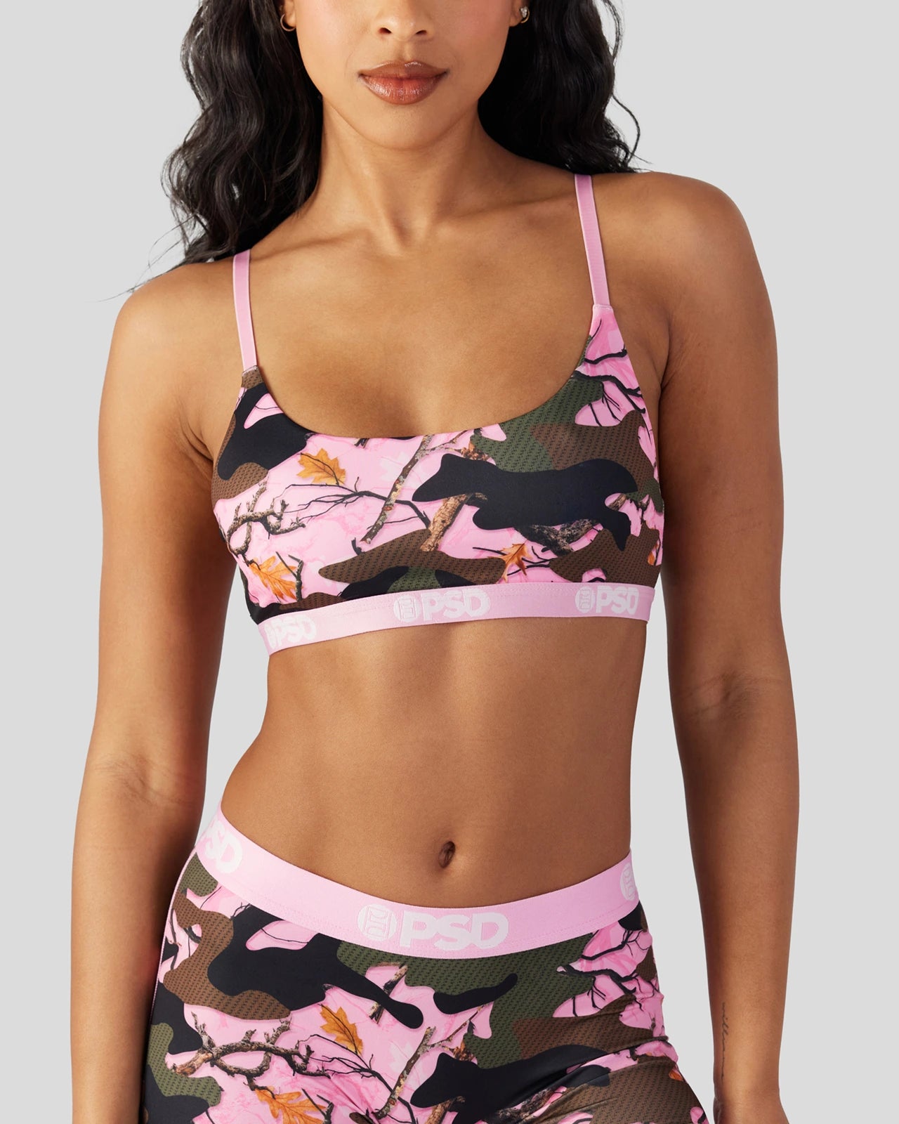 Camo gets girly with this new pink print. Made of our silky poly blend. the Stealth Woods Scoop Bralette almost feels like you’re not wearing a bra at all. It’s fully lined and features include adjustable straps. a cute scoop neckline. and a soft microfiber band that won’t ride or rub.